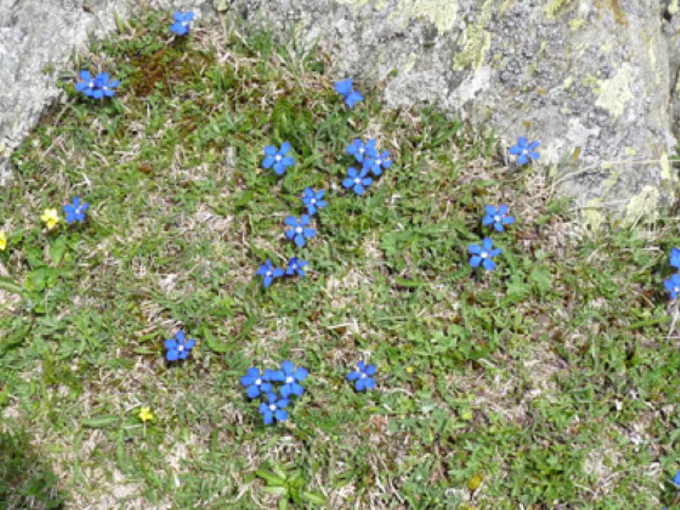Direkt unter den verschneiten Gipfel blühen im Tal die Krokusse, Huflattich, Küchenschellen und blaue Enziane verkünden das Erwachen der Wiesen und Wälder.